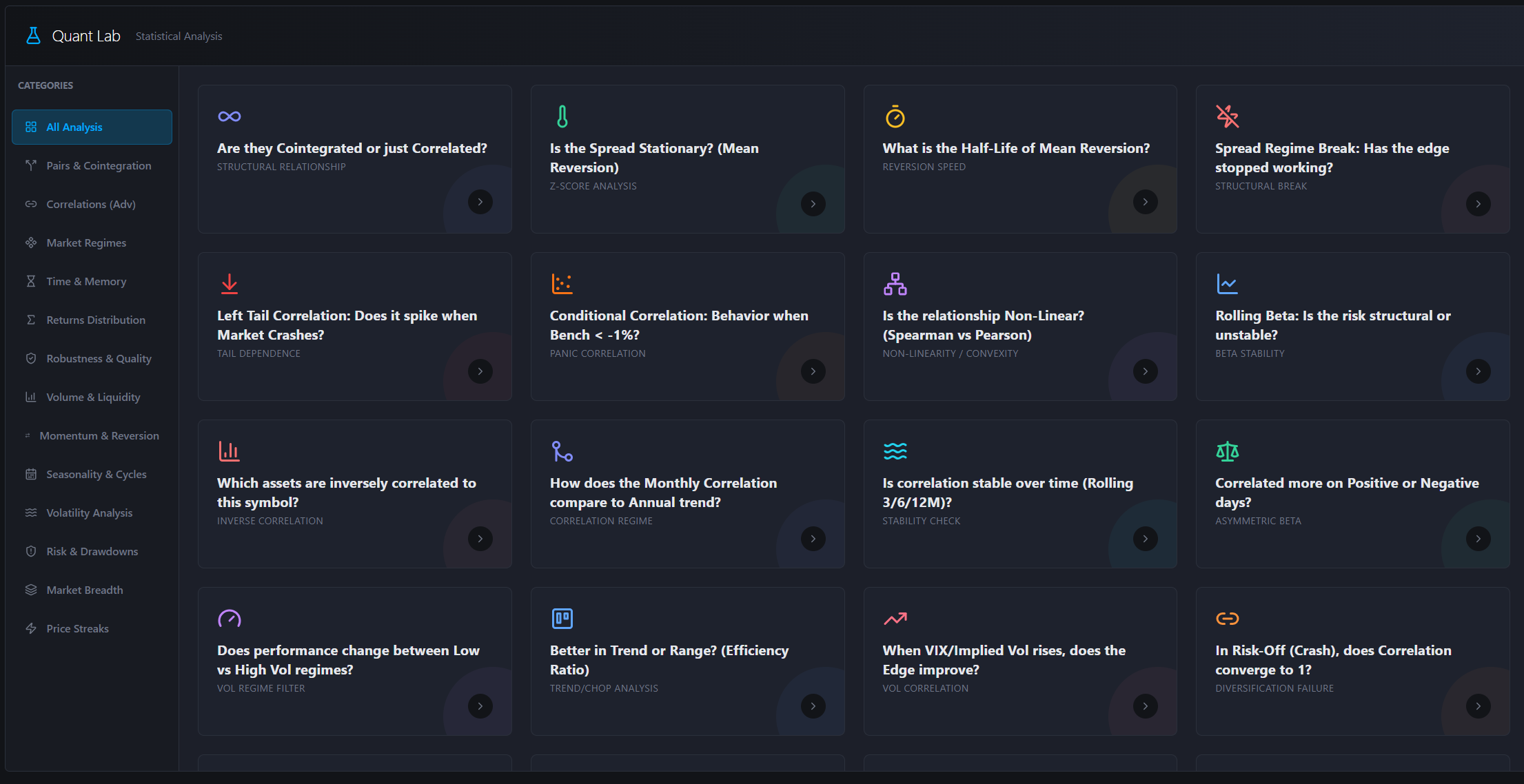 Un laboratorio statistico completo. Rispondi a domande come: "Cosa succede dopo 3 giorni verdi?", "Come performa l'asset in alta volatilità?". Oltre 60 moduli.